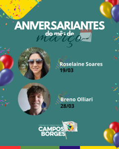 A Câmara de Vereadores de Campos Borges parabeniza Roselaine Soares (19/03) e Breno Olliari (28/03), desejando muita saúde, felicidade e sucesso em suas jornadas.